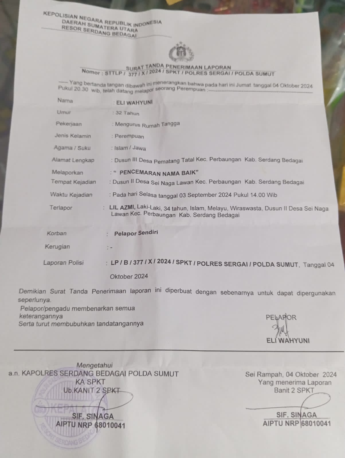 Kasus ini pun dilaporkan oleh (EW) ke Polres Serdang Bedagai (Sergai) dengan Nomor: STTLP/ 377/X/2024/SPKT/Polres Sergai/Polda Sumut.