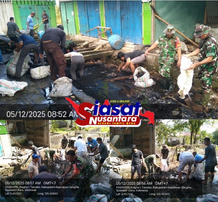 Sangihe, Siasatnusantara.com – Kampung Nagha I kembali menunjukkan kekompakan warganya dengan aparat TNI Koramil 1301-03/Tamako, dan Pemerintah Kecamatan melalui kegiatan Kerja Bakti Bersama yang dilaksanakan pukul 07.30 Wita, pembersihan drainase di belakang Pasar Ikan Matelagheng Tamako. Jumat, (05/12/2025)