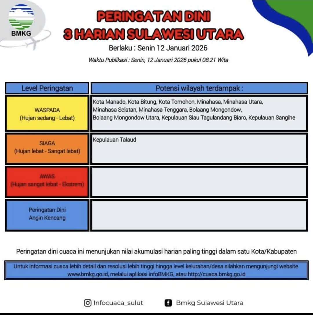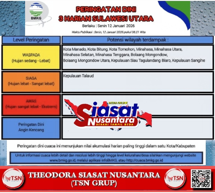 Sulawesi Utara, siasatnusantara.com – Badan Meteorologi, Klimatologi, dan Geofisika (BMKG) mengeluarkan peringatan dini terkait potensi cuaca ekstrem yang diprediksi terjadi di wilayah Sulawesi Utara (BMKG menetapkan status siaga untuk Kepulauan Talaud, sementara wilayah lain yang terdampak meliputi Manado, Bitung, Bolaang Mongondow (Bolmong), Bolaang Mongondow Utara (Bolmut), Sitaro, Minahasa Tenggara (Mitra), Sangihe, Minahasa, dan Minahasa Utara.