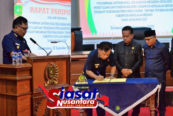 Selatpanjang-Riau, siasatnusantara.com – Pemerintah Kabupaten Kepulauan Meranti dan DPRD resmi mengesahkan Rancangan Perubahan Anggaran Pendapatan dan Belanja Daerah (APBD) Tahun Anggaran 2025 dalam rapat paripurna yang digelar di Gedung Paripurna DPRD Kabupaten Kepulauan Meranti. Kamis (25/9/2025).