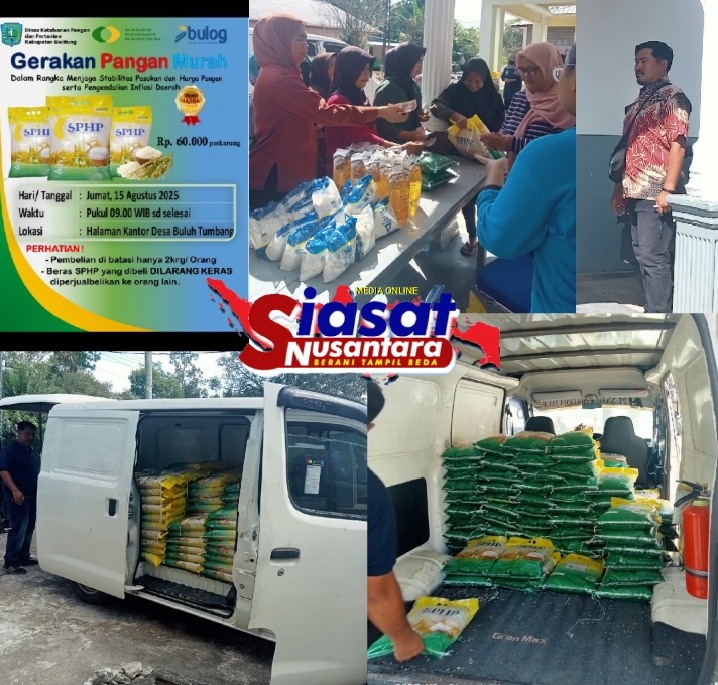 Belitung, siasatnusantara.com – Dalam rangka menjaga Stabilitas pasokan dan harga pangan serta pengendalian Inflasi Daerah, Pemerintah Desa Buluh Tumbang bersama DKPP Kabupaten Belitung, Badan pangan Nasional dan Bulog adakan gerakan pangan murah di halaman Kantor Desa Buluh Tumbang. Jumat (15/08/2025) dimulai pada pukul 09.00 WIB.