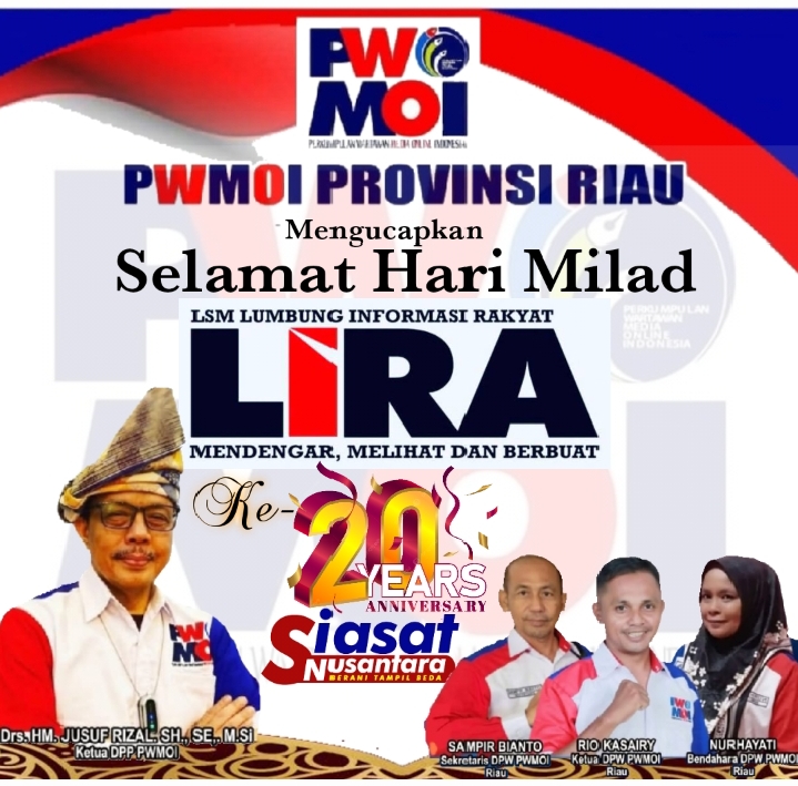 Kami, dari Dewan Pimpinan Wilayah (DPW) Perkumpulan Wartawan Media Online Indonesia (PWMOI) Provinsi Riau mengucapkan selamat Milad LSM LIRA ke 20.