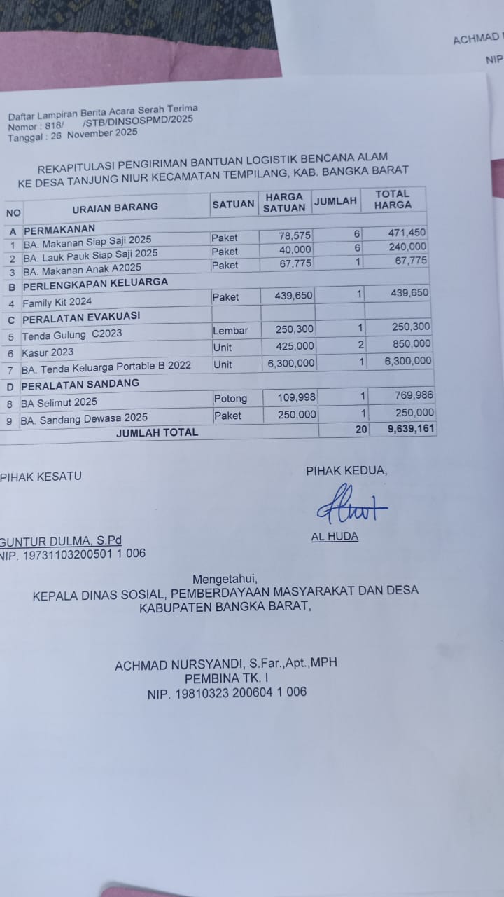 Penyaluran bantuan dilakukan oleh tim Dinsos PMD bersama perangkat desa dan aparat kewilayahan, di antaranya Kepala Desa Penyampak Doni, SH, Babinsa Tempilang Serka Wahyudi, BPBD Bangka Barat Megi Putra, Tagana Bangka Barat, dan Tagana Tempilang. Semua bantuan tercatat dalam Berita Acara Nomor 818/STB/DINSOSPMD/2025.