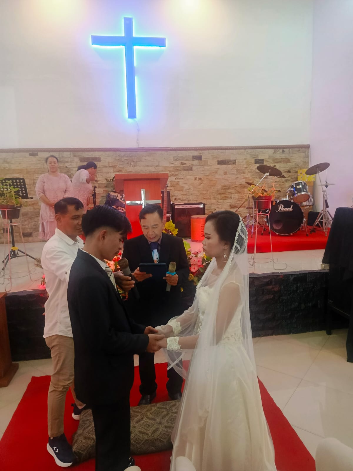Prosesi pernikahan di Gereja Kristen Nazarene Siloam oleh Pdt. Yeskiel, Acara berjalan khidmat dan penuh haru bahagia dengan doa restu dari keluarga, kerabat, dan para sahabat dekat.