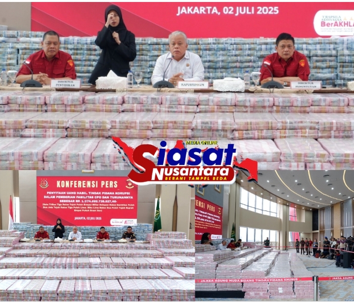 Jakarta, Siasatnisantara.com – Tim Penuntut Umum dari Direktorat Penuntutan pada Jaksa Agung Muda Bidang Tindak Pidana Khusus (JAM PIDSUS) kembali melakukan penyitaan pada tingkat penuntutan terhadap uang senilai Rp1.374.892.735.527 (satu triliun tiga ratus tujuh puluh empat miliar delapan ratus sembilan puluh dua juta tujuh ratus tiga puluh lima ribu lima ratus dua puluh tujuh rupiah) terkait perkara tindak pidana korupsi fasilitas ekspor Crude Palm Oil (CPO) dan turunannya pada industri kelapa sawit tahun 2022 atas nama 12 Terdakwa Korporasi. Rabu (02/07/2025).