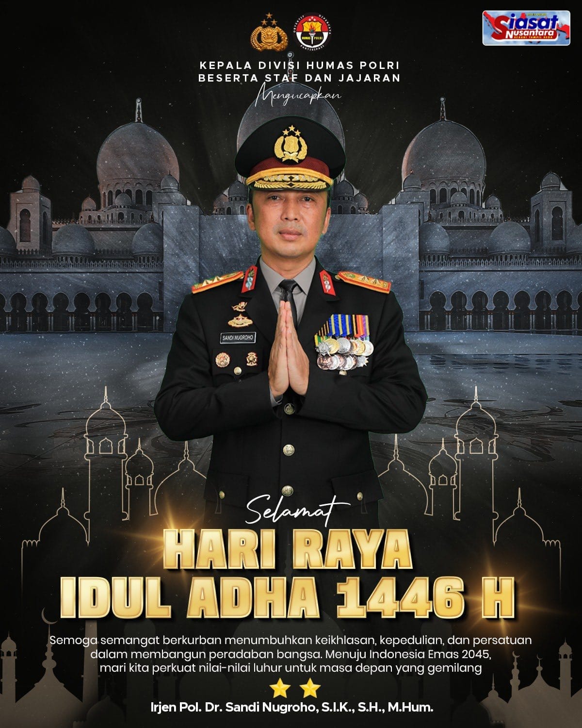Siasatnusantara.com – Jakarta, 6 Juni 2025 – Kepala Divisi Humas Polri, Irjen Pol. Dr. Sandi Nugroho, S.I.K., S.H., M.Hum., mengucapkan Selamat Hari Raya Idul Adha 1446 H kepada seluruh masyarakat Indonesia. Dalam kesempatan ini, Kadiv Humas Polri juga menyampaikan harapan agar semangat berkurban dapat menumbuhkan keikhlasan, kepedulian, dan persatuan dalam membangun peradaban bangsa.
