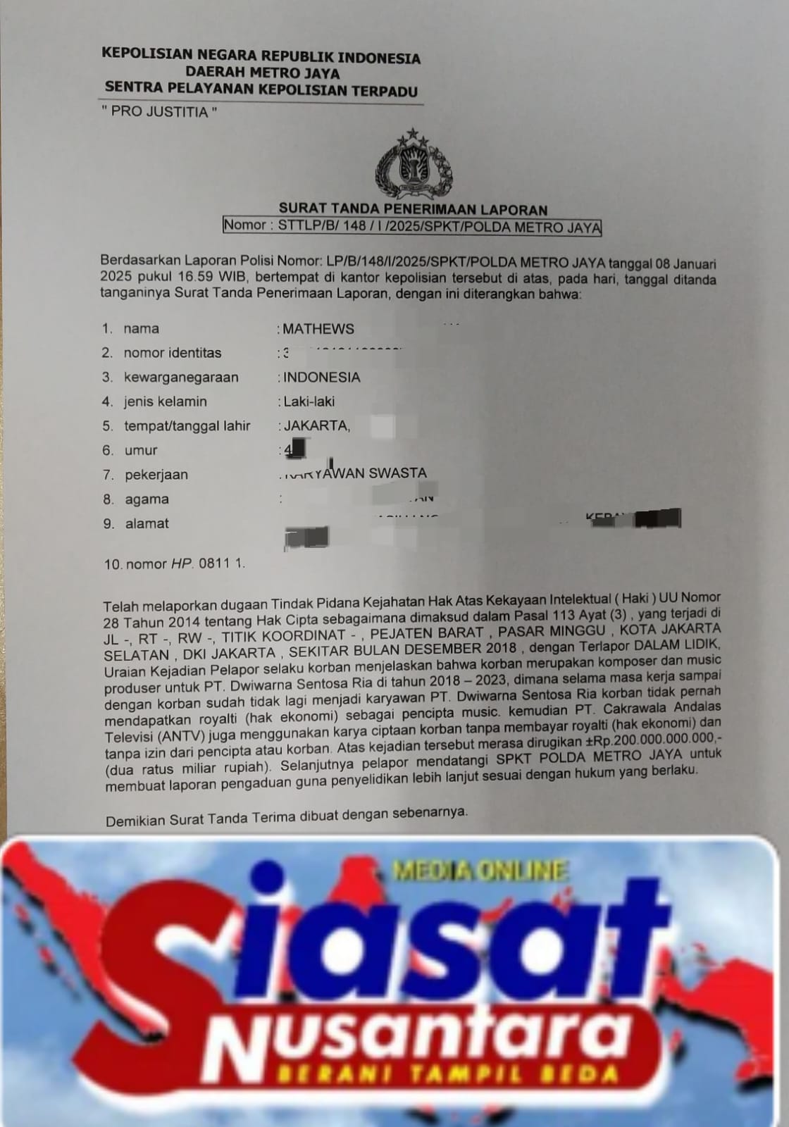 Siasatnusantara.com – Jakarta, 8 Januari 2025|| Setelah bertahun-tahun memperjuangkan haknya sebagai pencipta musik, Mathew Siahaan, seorang komposer dan juga Direktur PT. Dwiwarna Sentosa Ria periode 2018–2023, secara resmi melaporkan dugaan tindak pidana pelanggaran hak kekayaan intelektual (HAKI) ke Polda Metro Jaya. Laporan ini tercatat dengan nomor LP/B/148/I/2025/SPKT Polda Metro Jaya pada 8 Januari 2025 pukul 16.59 WIB.