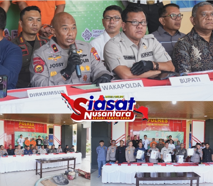 Riau, Kuansing, Siasatnusantara.com –  Kepolisian Daerah Riau bersama Polres Kuantan Singingi menggelar Press Conference, terkait hasil Operasi Penertiban Pertambangan Tanpa Izin (PETI) Kuantan 2025. Kegiatan yang dipimpin langsung oleh Wakapolda Riau, Brigjen Pol. A. Jossy Kusumo, S.H., M.Han., tersebut berlangsung di Mapolres Kuansing, Sabtu pagi (2/8/2025).