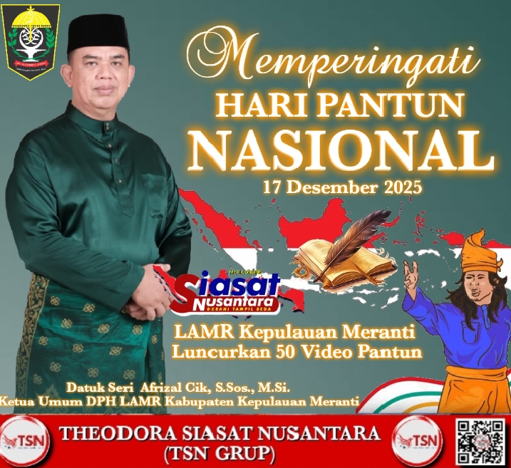 Meranti, siasatnusantara.com – Lembaga Adat Melayu Riau (LAMR) Kabupaten Kepulauan Meranti meluncurkan 50 video pantun. Setiap satu video yang terdiri dari satu tema pantun, memuat 10 bait pantun. Pantun-pantun tersebut berisikan permasalahan kehidupan masyarakat dan keadaan alam di Riau. Hal ini diungkapkan oleh Ketua Umum Dewan Pimpinan Harian (DPH) LAMR Kabupaten Kepulauan Meranti, Datuk Seri Afrizal Cik, S.Sos., M.Si. Rabu, (17/12/2025).