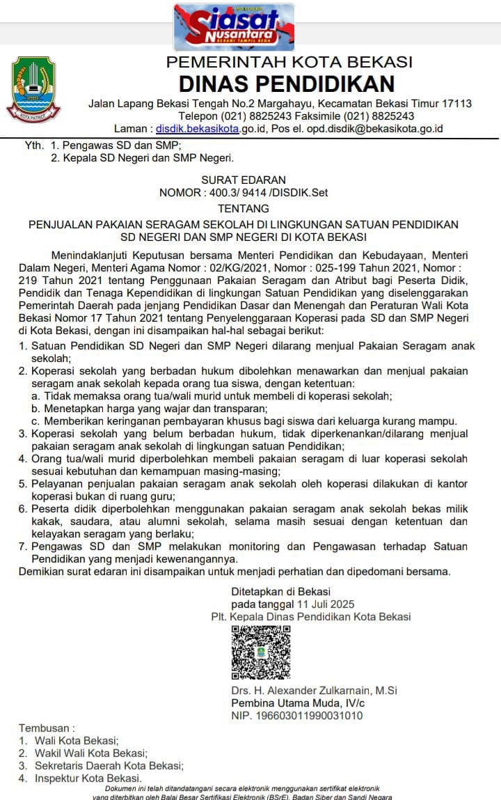 Kota Bekasi,siasatnusantara.com – Alex Zulkarnaen K epala Dinas Pendidikan Kota Bekasi menjadi sorotan publik, setelah mengeluarkan SE NO: 400.3/9414/DISDIK.set, perihal penjualan pakaian seragam sekolah di lingkungan satuan pendidikan SD, SMP Negeri se-Kota Bekasi , Jumat (11/7/2025).