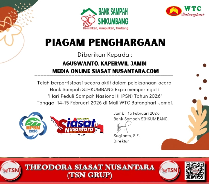 Dengan diterimanya penghargaan ini, Siasat Nusantara Wilayah Jambi menegaskan komitmennya sebagai Media Online yang terus mengedepankan profesionalisme dan integritas dalam setiap pemberitaan.