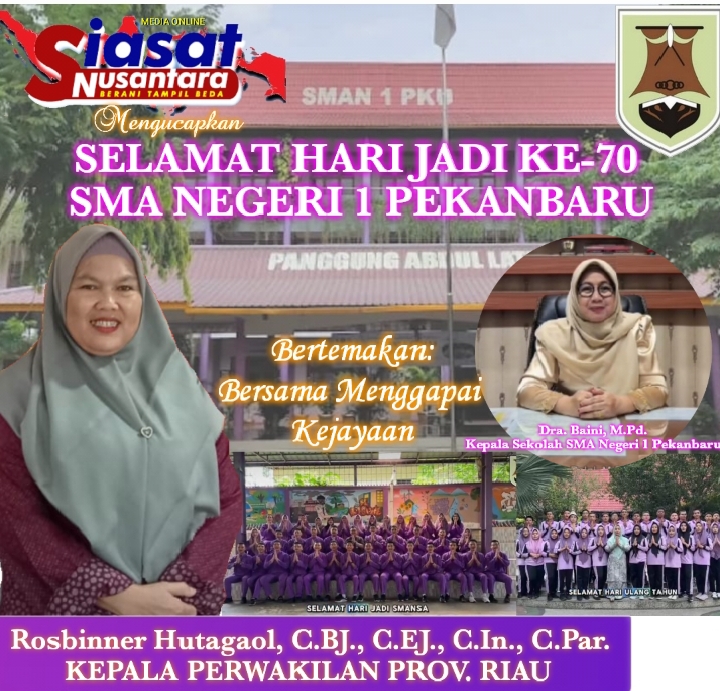 Pekanbaru, Siasatnusantara.com – Jatuh pada 1 Agustus 2025 SMA Negeri 1 Pekanbaru hari ini merayakan hari jadinya yang ke-70. Segenap seluruh jajaran Redaksi Media Siasat Nusantara mengucapkan selamat hari jadi kepada seluruh siswa-siswi dan Alumni sekolah. Sabtu (02/08/2025).