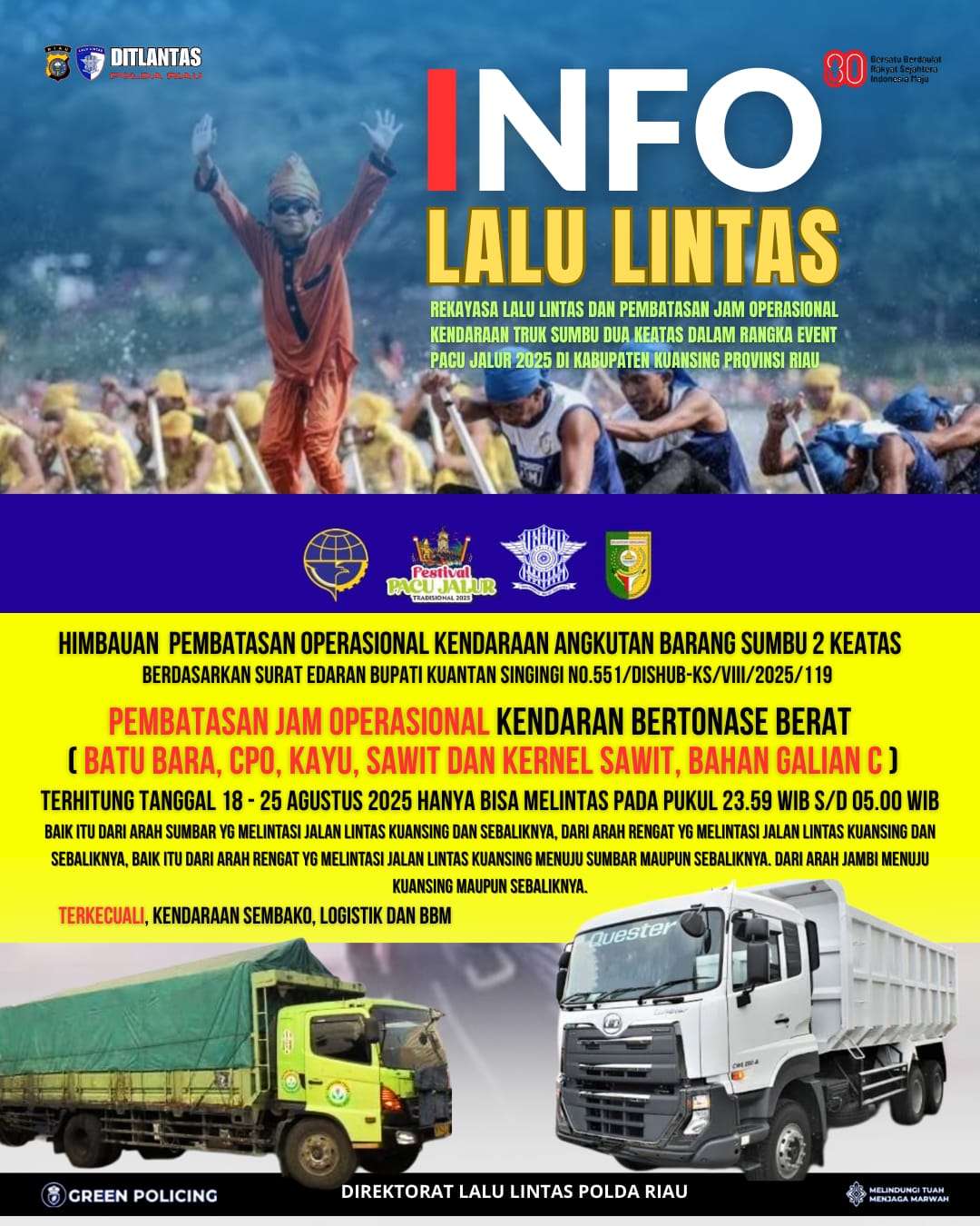 Pekanbaru, Siasatnusantara.com – Dalam rangka mendukung kelancaran perhelatan Festival Pacu Jalur 2025 di Kabupaten Kuantan Singingi (Kuansing), seluruh pengemudi angkutan barang dengan sumbu dua ke atas diimbau untuk mematuhi aturan pembatasan jam operasional yang telah ditetapkan, Senin (18/8/2025).