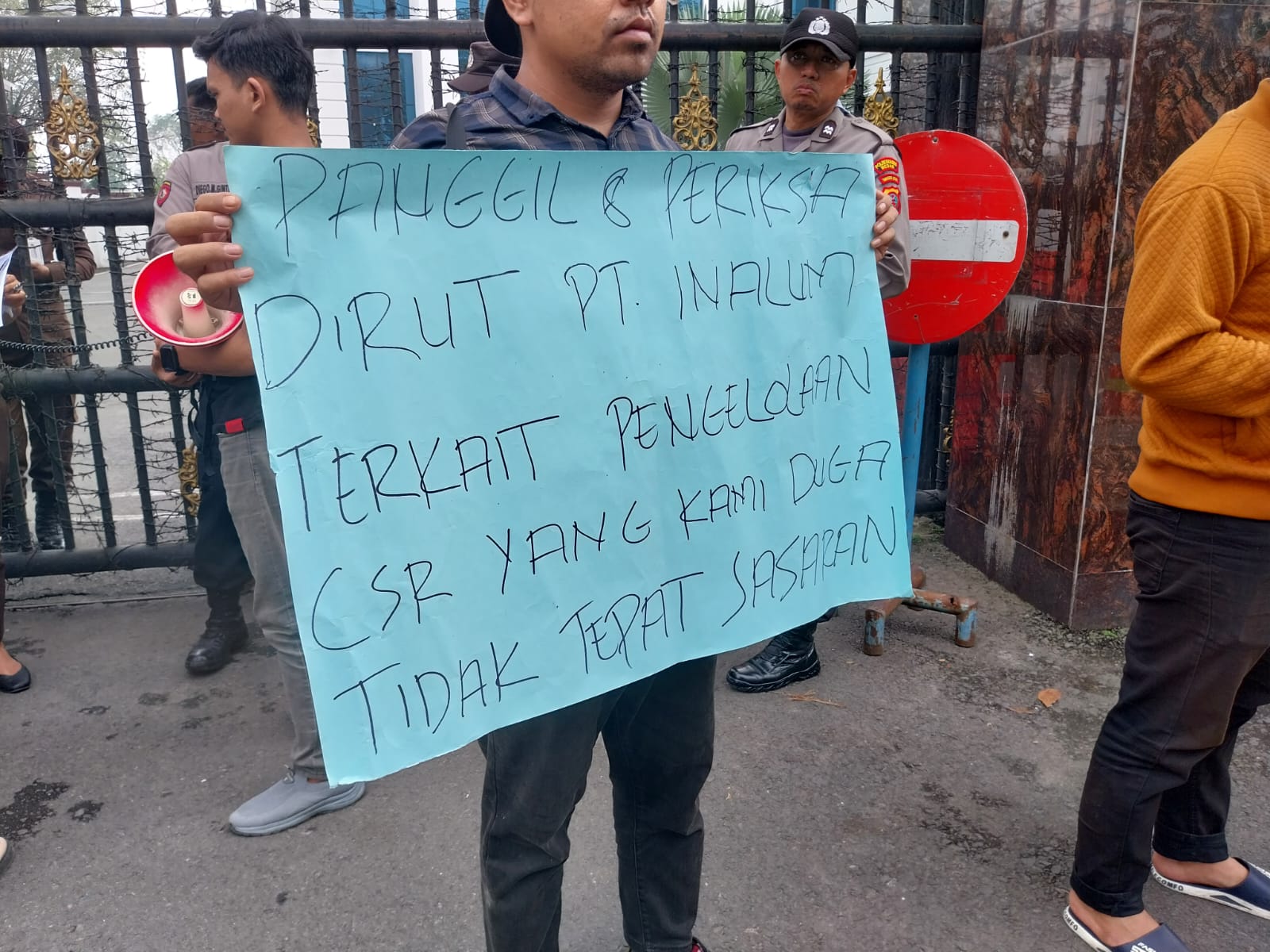Dalam aksinya, massa menyuarakan adanya dugaan penyalahgunaan dalam penyaluran dana CSR yang dilakukan oleh PT.Inalum. Mereka meminta kepada pimpinna KPK RI untuk segera memanggil dan memeriksa Dirut PT. Inalum terkait dugaan adanya ketidak tepatan sasaran dalam penggunaan CSR di PT.Inalum.