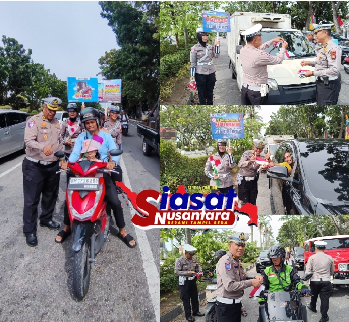 Pekanbaru, siasatnusantara.com – Suasana pagi di Jalan Diponegoro, Pekanbaru, terasa berbeda di simpang lampu merah depan kediaman Kapolda Riau, para pengendara roda dua dan roda empat tersenyum ketika disapa oleh personel Subdit Kamsel Ditlantas Polda Riau. Tidak hanya sapaan ramah, mereka juga menerima bunga, bendera Merah Putih, serta brosur himbauan keselamatan berkendara. Kamis (14/8/2025).