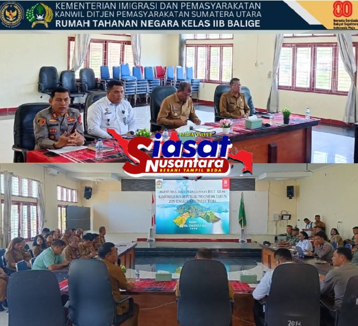 Balige, siasatnusantara.com – Rumah Tahanan Negara Kelas IIB Balige Kanwil Ditjen Pemasyarakatan Sumatera Utara menghadiri rapat finalisasi persiapan peringatan Hari Ulang Tahun (HUT) Kemerdekaan Republik Indonesia ke-80 tingkat Kabupaten Toba. Selasa (12/08/2025)