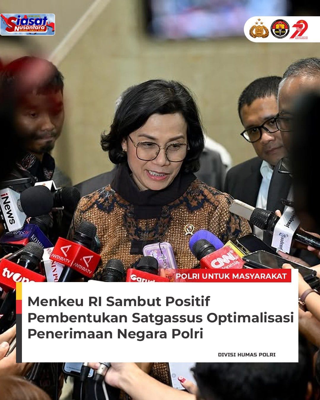 Siasatnusantara.com – Jakarta, 18 Juni 2025 – Menteri Keuangan RI, Sri Mulyani Indrawati, menyambut positif inisiatif Kapolri Jenderal Polisi Drs. Listyo Sigit Prabowo dalam membentuk Satuan Tugas Khusus (Satgassus) Optimalisasi Penerimaan Negara. Satgas ini dibentuk untuk mendukung Anggaran Pendapatan dan Belanja Negara (APBN) dengan mendampingi kementerian dalam meningkatkan penerimaan negara di berbagai sektor.