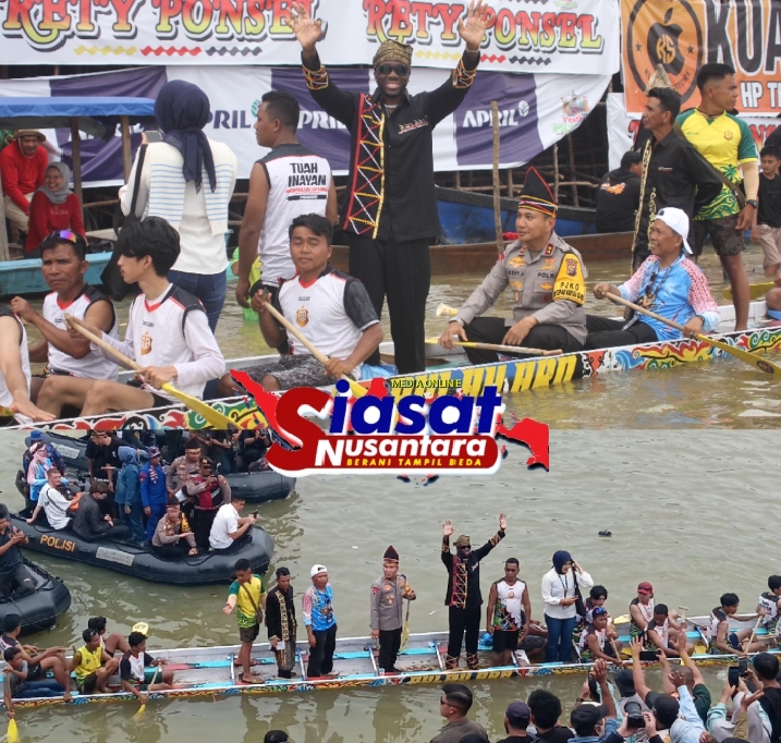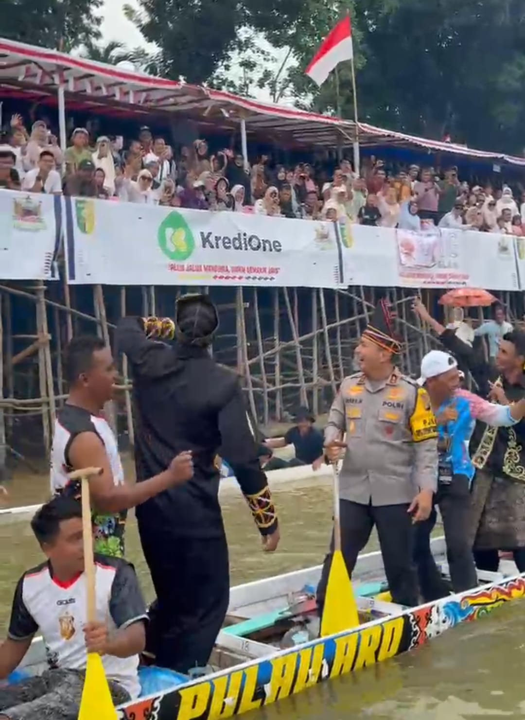 Melly Mike berada di atas perahu bersama Kapolda Riau Irjen Herry Heryawan. Dikha bocah Pacu Jalur juga ikut dalam jalur yang sama.
