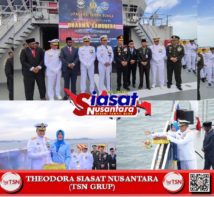 Sorong, siasatnusantara.com – Jajaran TNI Angkatan Laut di seluruh wilayah Negara Kesatuan Republik Indonesia (NKRI), hari ini Kamis 15 Januari 2026, memperingati Hari Dharma Samudera melalui upacara dan tabur bunga di laut. Untuk di wilayah Papua Barat Daya, peringatan Hari Dharma Samudera 2026 dilaksanakan di perairan Sorong, diatas KRI Balongan 908.